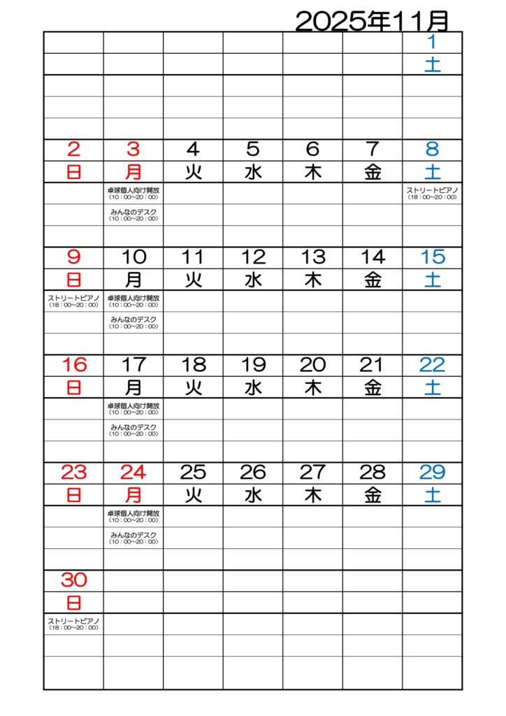 東館1階・ロビー11月行事予定(ストリートピアノ・卓球個人向け開放・みんなのデスク)