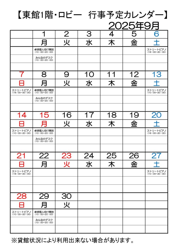 東館1階・ロビー 9月分の行事予定下記の通りとなります。