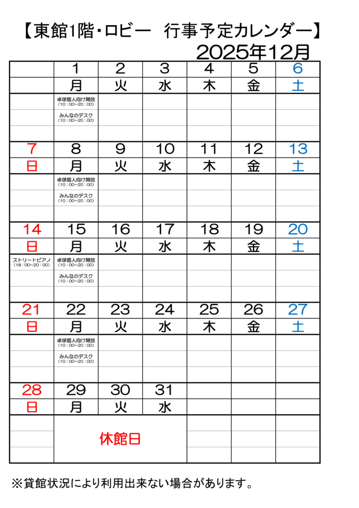 東館1階・ロビー 12月分行事予定 下記の通りとなります。