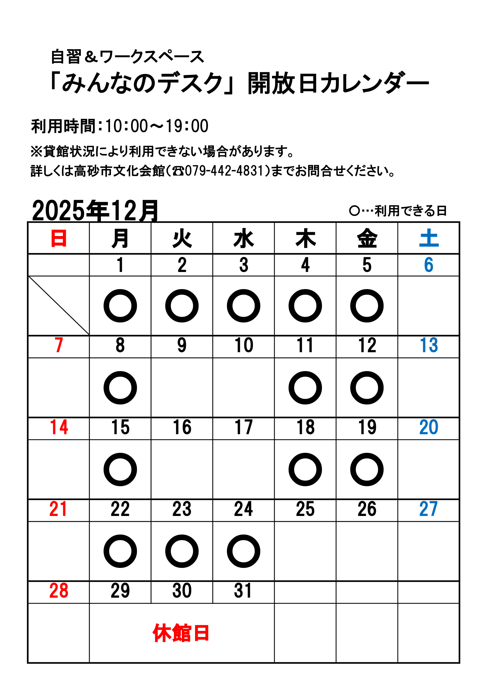 ☆自習&ワークスペース「みんなのデスク」12月開放日カレンダー☆