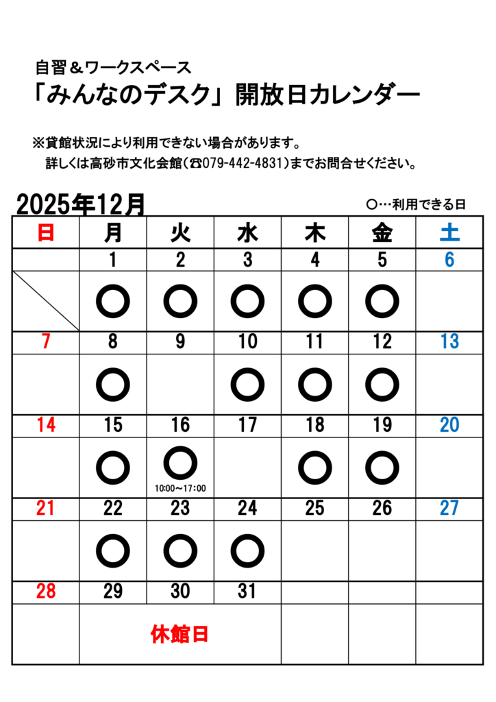 ☆自習&ワークスペース「みんなのデスク」12月開放日カレンダー☆