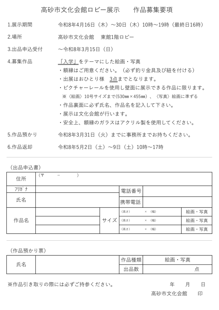 高砂市文化会館東館1階ロビー展 作品募集